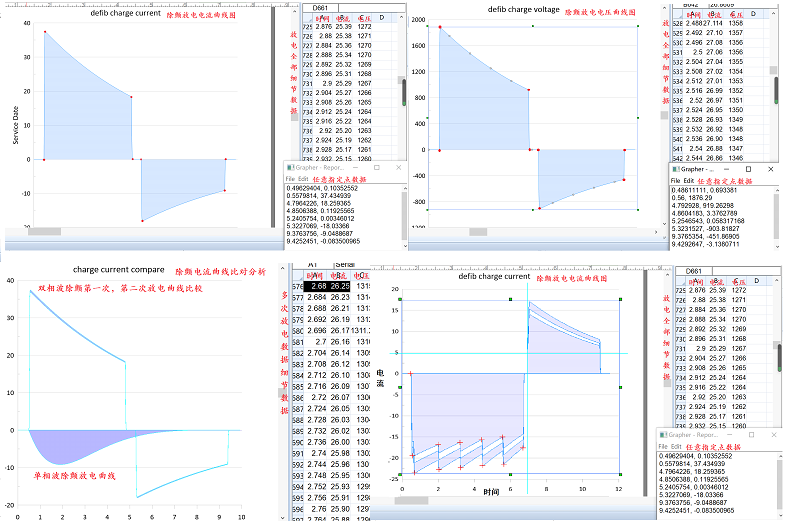 雙相波的第一相(或第二相)的初始最大電流,初始極限電壓,末端極限電壓,末端極限電流,每相放電時間,每相放電能量。雙相之間的相間延遲時間,每相的時間上升沿,時間下降沿等。