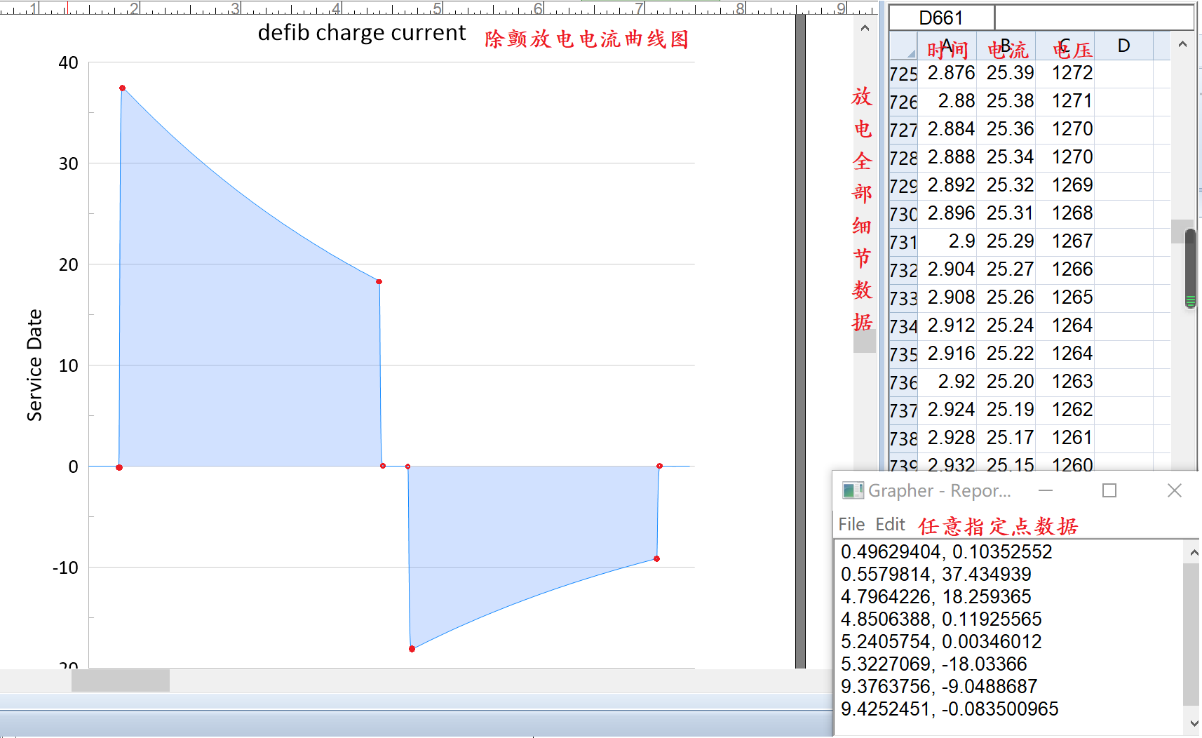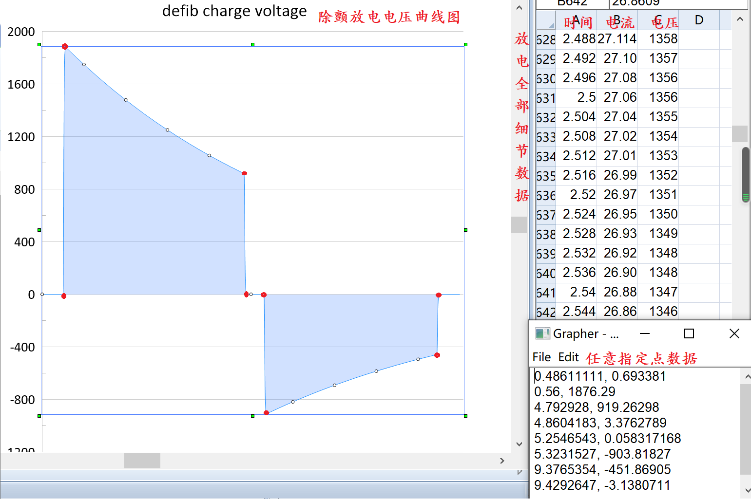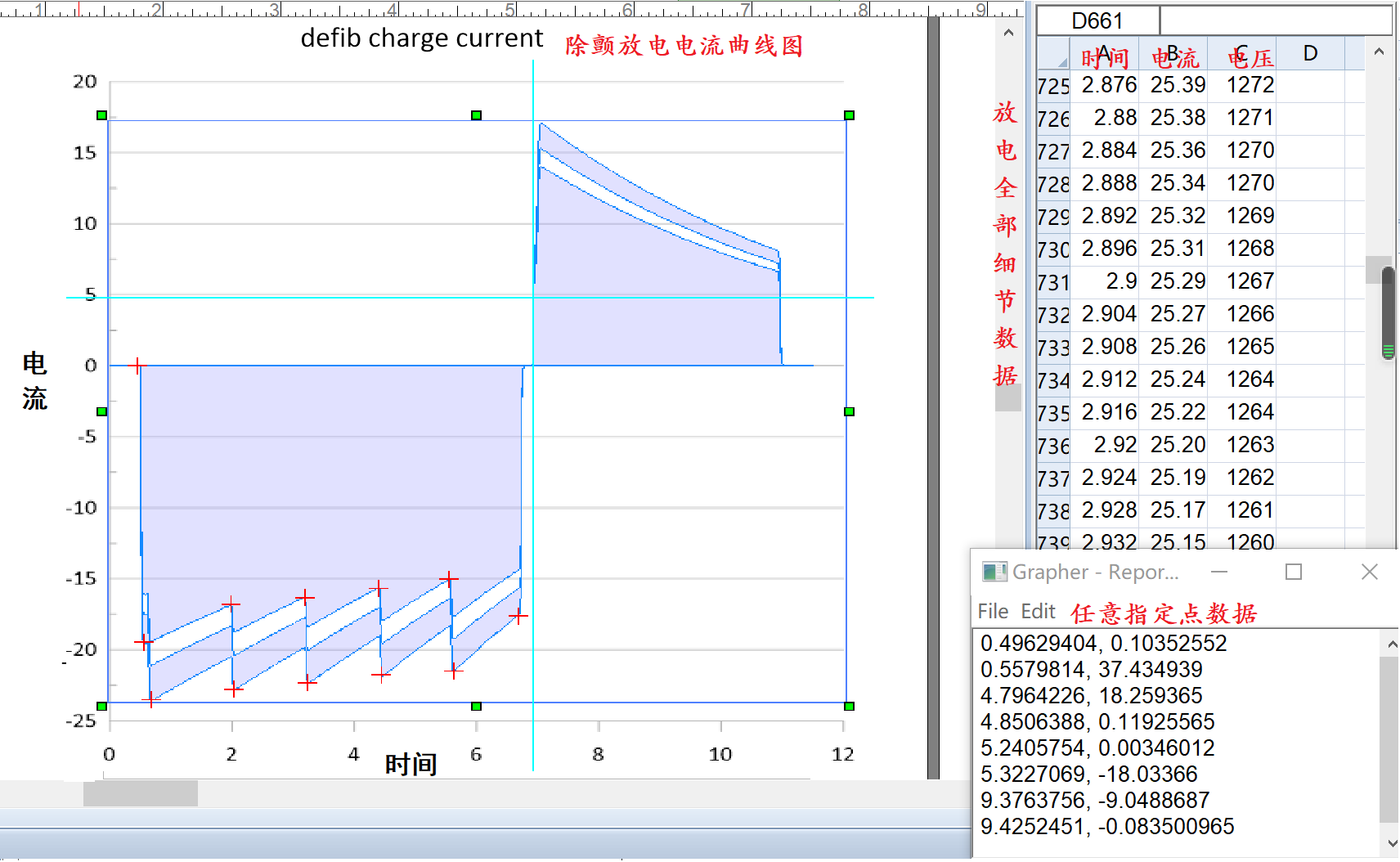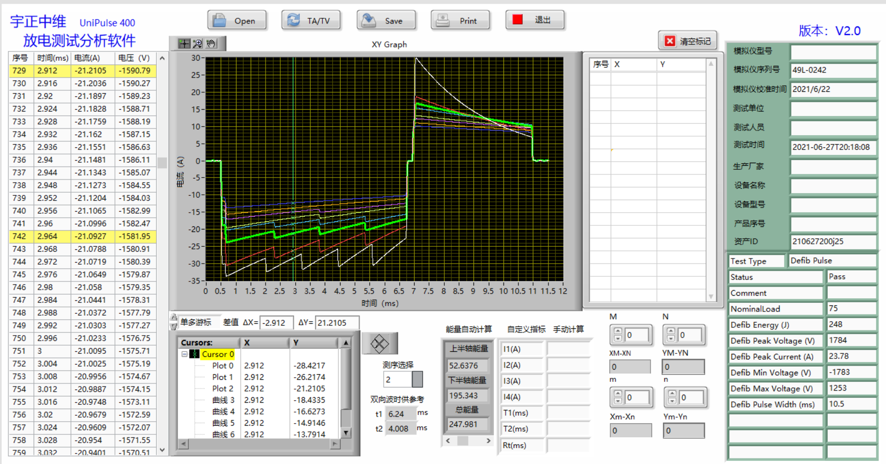 3、使用除顫能量分析軟件,能在電腦端重現(xiàn)整個能量釋放曲線,直觀讀出放電結(jié)果及放電參數(shù):