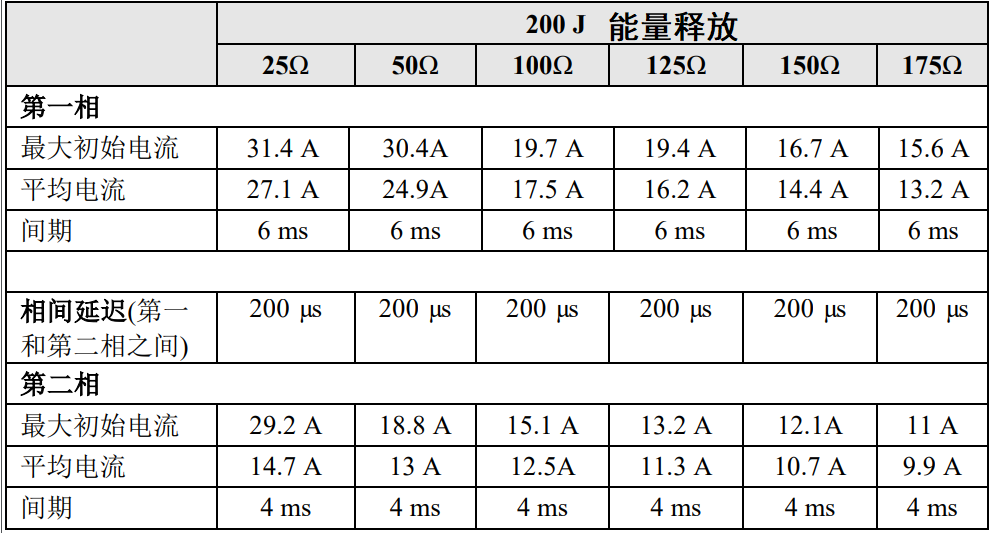 雙相波的第一相(或第二相)的初始峰值電流,初始峰值電壓,末端峰值電壓,末端峰值電流,每相放電時間,每相放電能量。雙相之間的相間延遲時間,每相的時間上升沿,時間下降沿等。