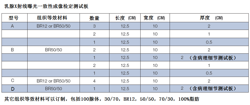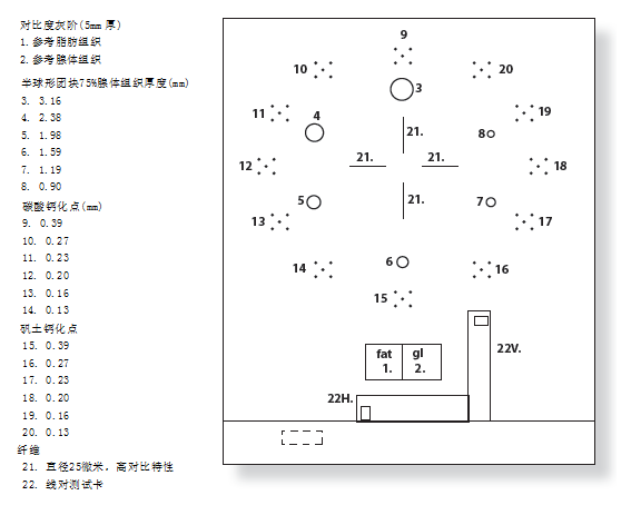 乳房射線成像檢定模體設(shè)計用于通過定量評估系統(tǒng)對小的結(jié)構(gòu)(臨床上常見)成像的能力,對乳房成像系統(tǒng)的性能進(jìn)行測試。模體內(nèi)的物體模擬鈣化、體內(nèi)導(dǎo)管的纖維性鈣化,測試成像低對比分辨極限值