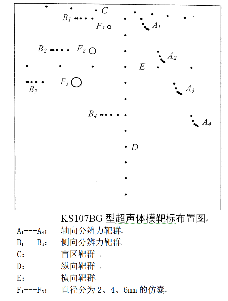 系KS107BD型的擴(kuò)展。其對(duì)線陣探頭的適用性與KS107BD型相同,但靶標(biāo)設(shè)置和布局對(duì)機(jī)械扇掃、凸陣、相控陣等扇形圖像儀器更為科學(xué)、恰當(dāng)??蓽y(cè)扇形開角120º,獨(dú)立分辨力靶群組。