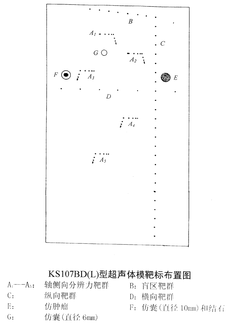 適用于4MHz以下頻段B超儀器。檢測項目包括盲區(qū)、探測深度、軸(縱)向與側(橫)向分辨力、縱向與橫向幾何誤差,并可考察其對囊腫、腫瘤、結石等典型病灶的成像情況。