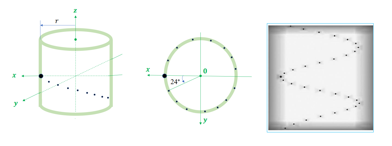 內(nèi)嵌已知尺寸的螺旋分布的定位鋼球的有機(jī)玻璃柱形圓筒,如果需要提高校準(zhǔn)精度可增加鋼珠的數(shù)量,或在探測(cè)器能覆蓋的范圍內(nèi),提升螺旋直徑和長(zhǎng)度。