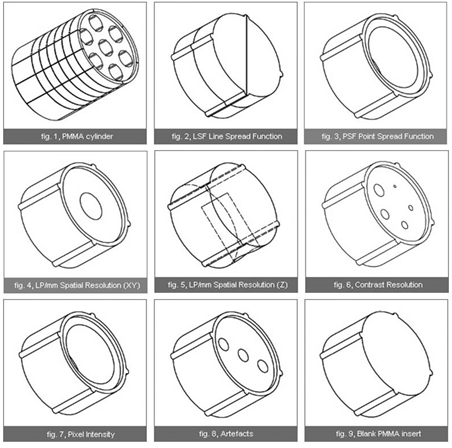1. 該模體主體外形為直徑160mm的圓柱體,背景材料由聚甲基丙烯酸甲酯(PMMA)構(gòu)成,密度為1.20 +/- 1.00% g/cm3,具有固定檢測插件的凹槽。