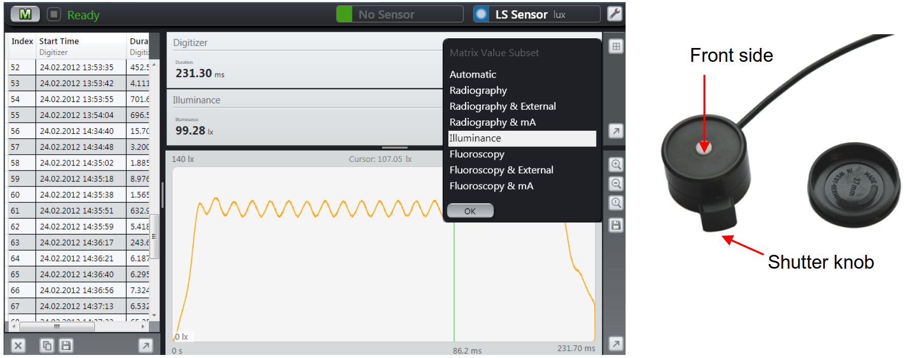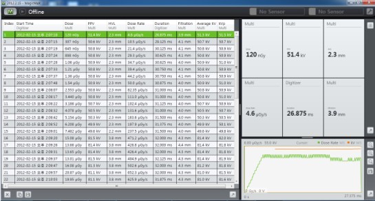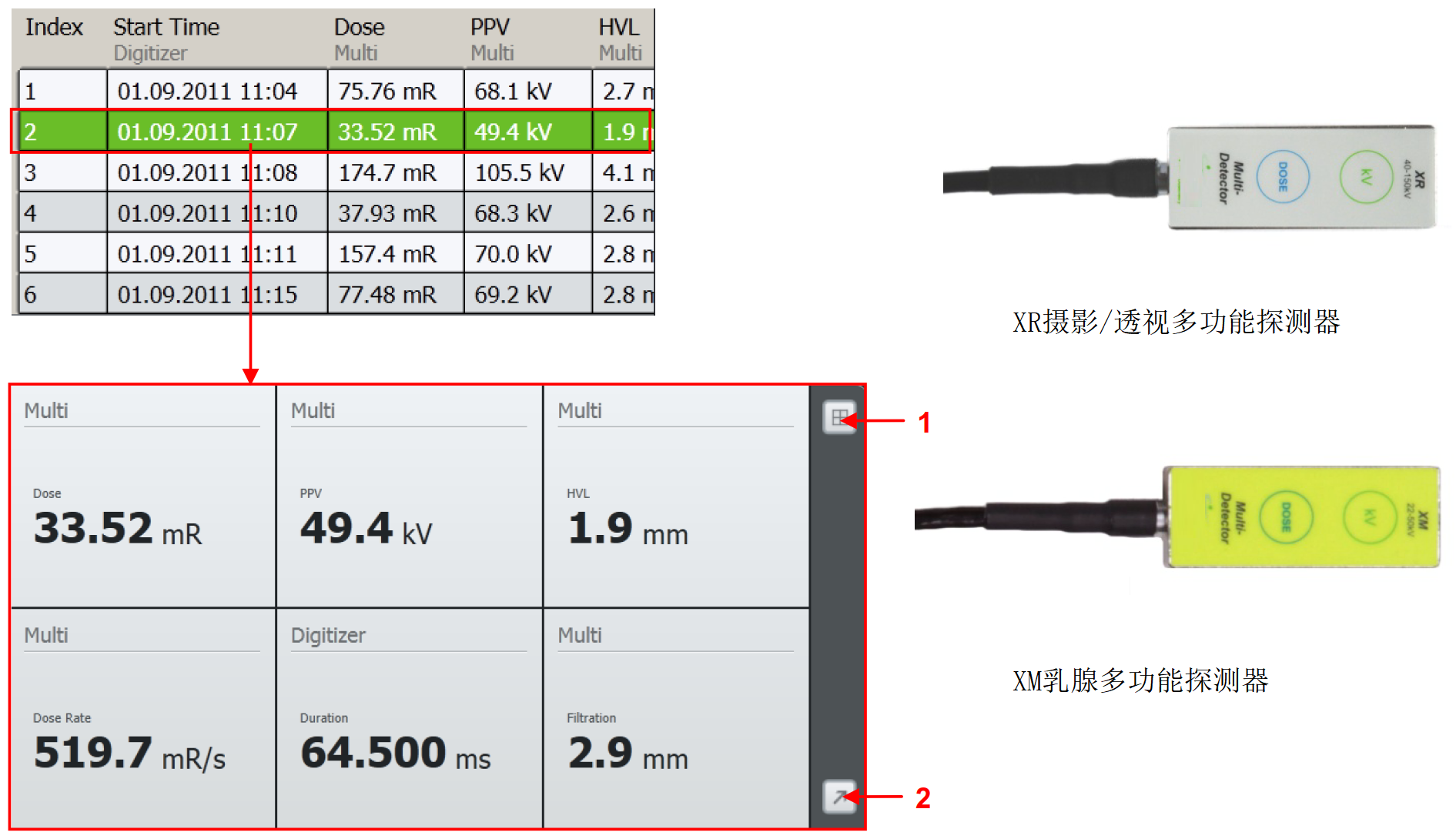 主機(jī)使用UMPC個(gè)人微機(jī)系統(tǒng), 可檢測各種型號(hào)X射線機(jī), 一次曝光測量射線參數(shù):千伏值kV, 劑量Dose, 劑量率Dose rate, 曝光時(shí)間time, 半值層HVL和總濾過。所有測量數(shù)據(jù)和波形需要存至電腦,即可方便地進(jìn)行數(shù)據(jù)的存儲(chǔ)、打印及傳輸操作,主機(jī)與探測器的連接采用標(biāo)準(zhǔn)的USB接口。提供可選的附加探測器接口,可額外選擇連接一個(gè)半導(dǎo)體探測器,即在同一射野內(nèi)一次曝光測量兩個(gè)場位的射線參數(shù)。具體功能和參數(shù)由所配置的探測器決定,詳細(xì)見技術(shù)參數(shù)表中的描述。
