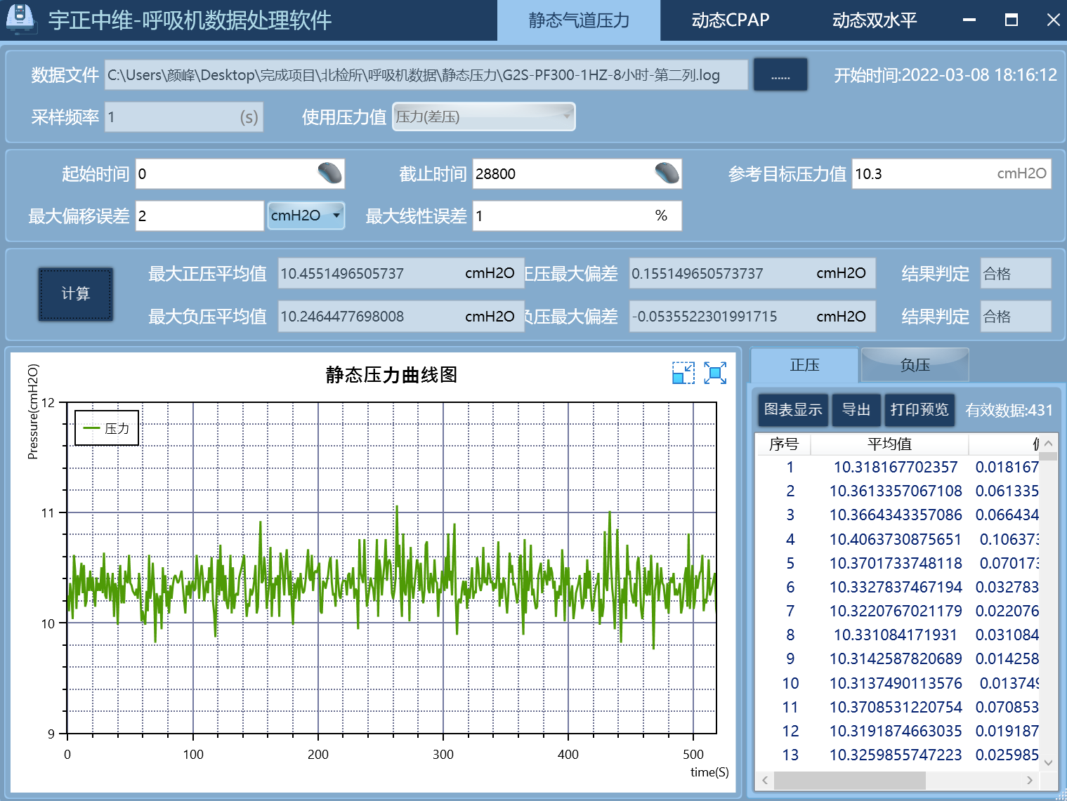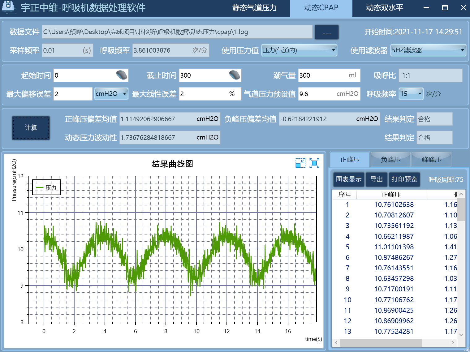 靜態(tài)氣道壓力的數(shù)據(jù)統(tǒng)計列表(靜態(tài)壓力值)并進行圖表顯示,自定義感興趣分析周期,自動計算最大正壓平均值,最大負壓平均值,最大偏移誤差,原始計算數(shù)據(jù)。
