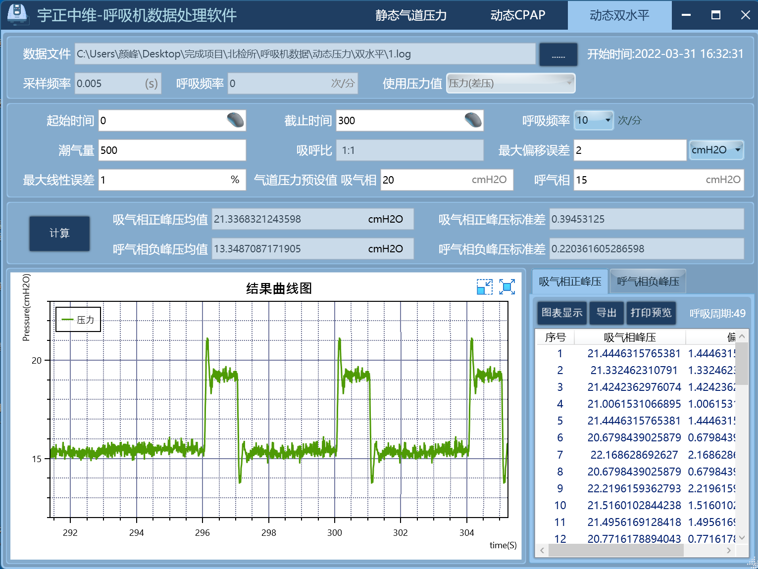 動態(tài)雙水平氣道壓力的數(shù)據(jù)統(tǒng)計列表(吸氣相峰壓,呼氣相峰壓)并進行圖表顯示,自定義感興趣分析周期,自動計算吸氣相和呼氣相的峰壓平均值和峰壓偏差平均值,峰壓標準差(動態(tài)壓力波動性)