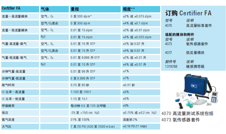 Certifier® 4070 型 FA 呼吸機(jī)檢測(cè)系統(tǒng)能夠檢測(cè)呼吸機(jī)性能的多個(gè)參數(shù)。它專(zhuān)用于測(cè)量公共機(jī)構(gòu)、家庭護(hù)理、野外服務(wù)、實(shí)驗(yàn)室及生產(chǎn)應(yīng)用方面的空氣、氧氣和笑氣流量和壓力。該 Certifier FA 呼吸機(jī)檢測(cè)系統(tǒng)是一種由電池供電的流量分析器,它還能夠檢測(cè)其他各種醫(yī)療設(shè)備,如麻醉氣輸送機(jī)和氧氣濃縮器等。Certifier FA 4072 低流量模塊可測(cè)試氧濃縮和其他低流量裝置。4072可和FA 4070呼吸機(jī)分析儀配套使用。Certifier FA 和FA(+) 氧傳感套件4073可和Certifier FA 4070配套使用。