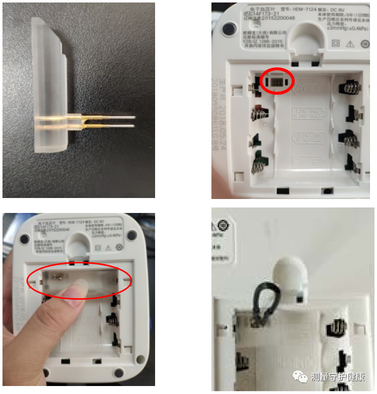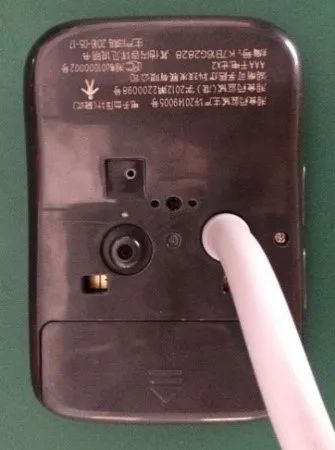 ① 拔下電池,換為交流電源供電。將專用“鑰匙”(或合適的短接線)插入電池倉(cāng)中的小孔,適當(dāng)用力壓緊。