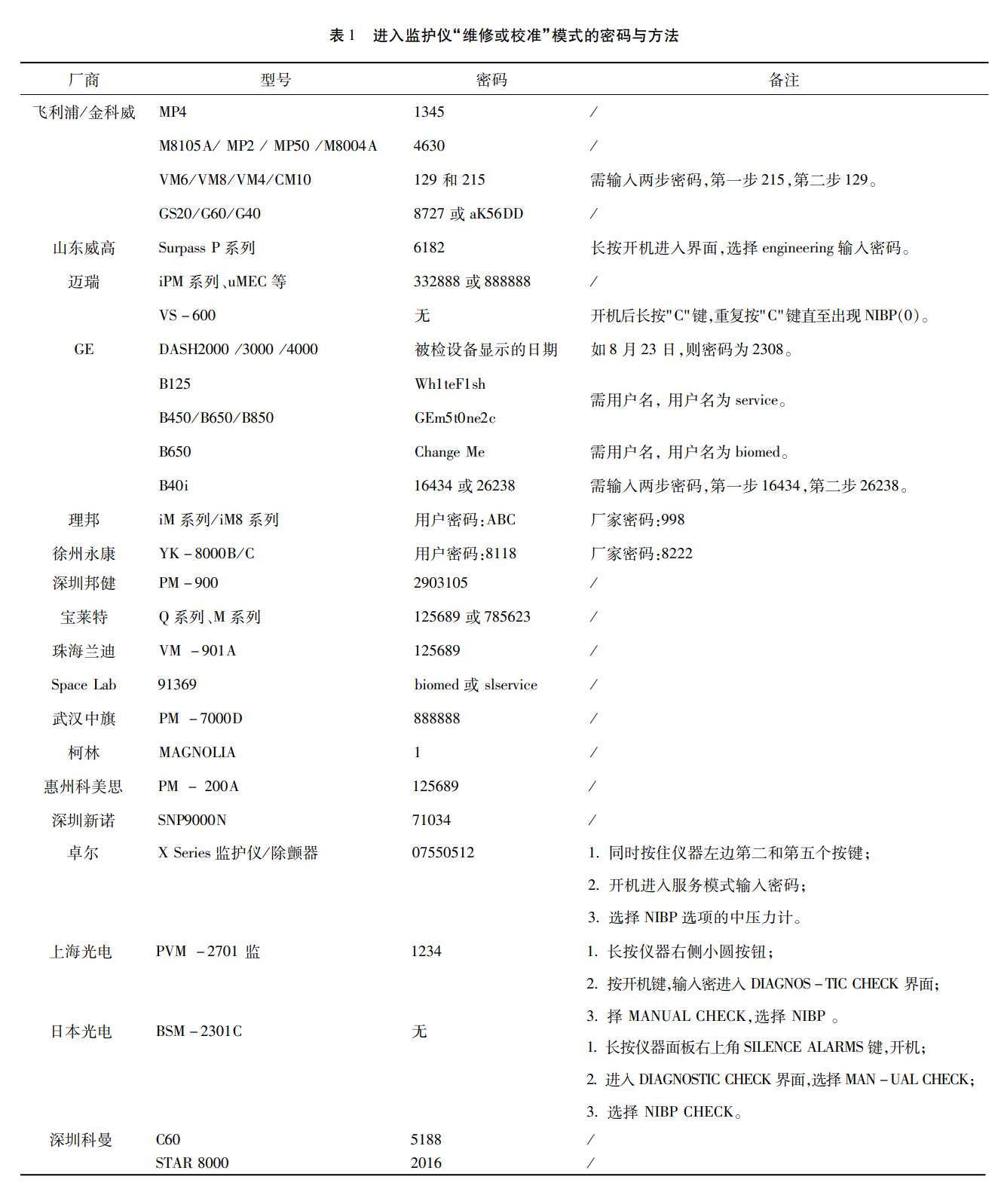 大多數(shù)型號(hào)的監(jiān)護(hù)儀在檢定靜態(tài)壓力示值誤差、靜態(tài)壓力測(cè)量范圍、氣密性三個(gè)項(xiàng)目時(shí),均需進(jìn)入“維修或校準(zhǔn)模式”,部分型號(hào)的監(jiān)護(hù)儀可直接在監(jiān)護(hù)儀NIBP界面上設(shè)置開(kāi)展檢定。本文對(duì)不同品牌不同型號(hào)的監(jiān)護(hù)儀進(jìn)入“維修或校準(zhǔn)”模式的方法與密碼進(jìn)行了總結(jié)(見(jiàn)表 1)。 進(jìn)入監(jiān)護(hù)儀“維修或校準(zhǔn)”模式的方法與密碼這里只是進(jìn)行了簡(jiǎn)單的歸納,在實(shí)際工作中遇到無(wú)法進(jìn)入“維修或校準(zhǔn)”模式的情況應(yīng)積極與生產(chǎn)廠家聯(lián)系。
