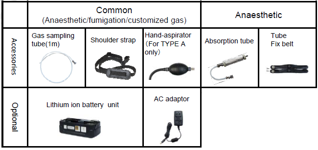 標(biāo)準(zhǔn)附件:采樣管1套,背包1只,手動(dòng)吸引球1只,“T”型采樣配件(僅用于麻醉劑檢測)1套,安裝專用工具1只,堿性電池4節(jié)