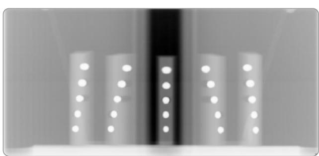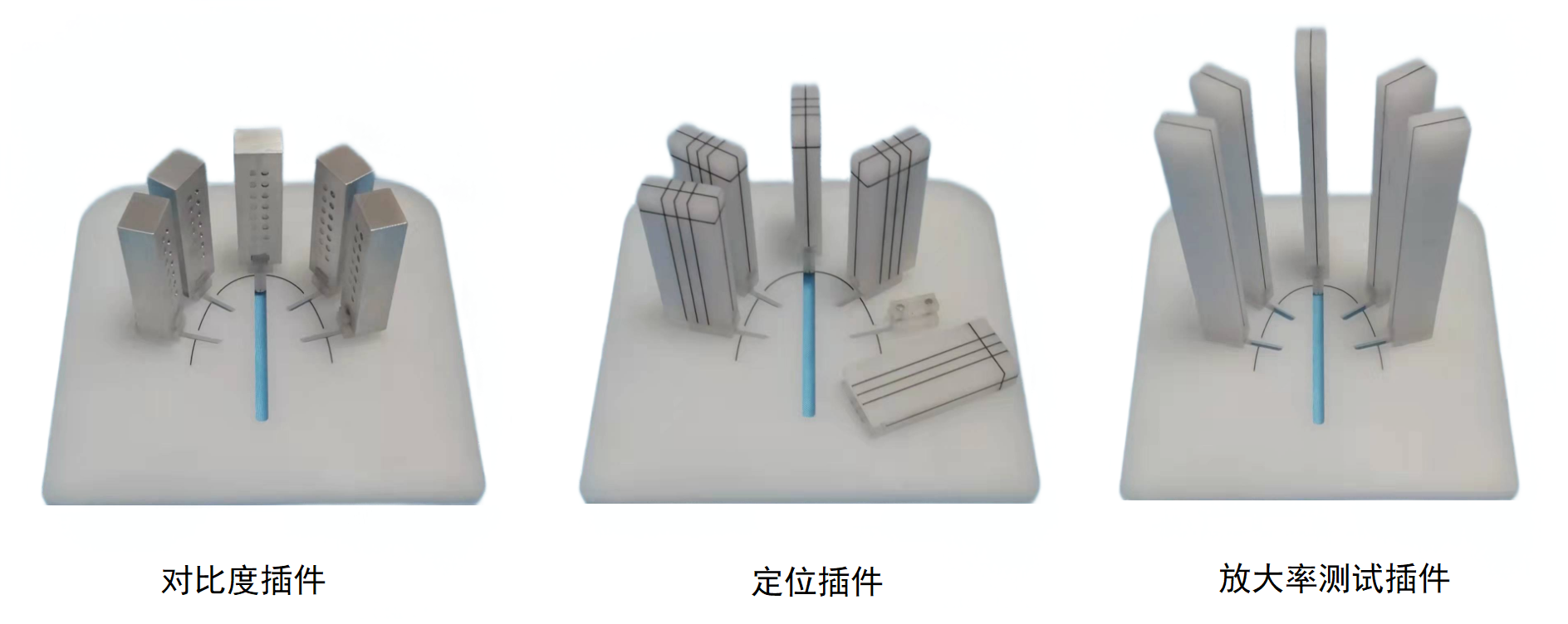 該組模型由聚焦層定位模塊、全景放大率一致性測試模塊、全景低對比度測試模塊3部分構(gòu)成。這三種模塊測試時都固定在如下圖所示的一塊平板上,全景牙科機(jī)掃描該測試體模可以對影響圖像質(zhì)量的參數(shù)進(jìn)行全面評估??捎糜谀z片和數(shù)字系統(tǒng)。