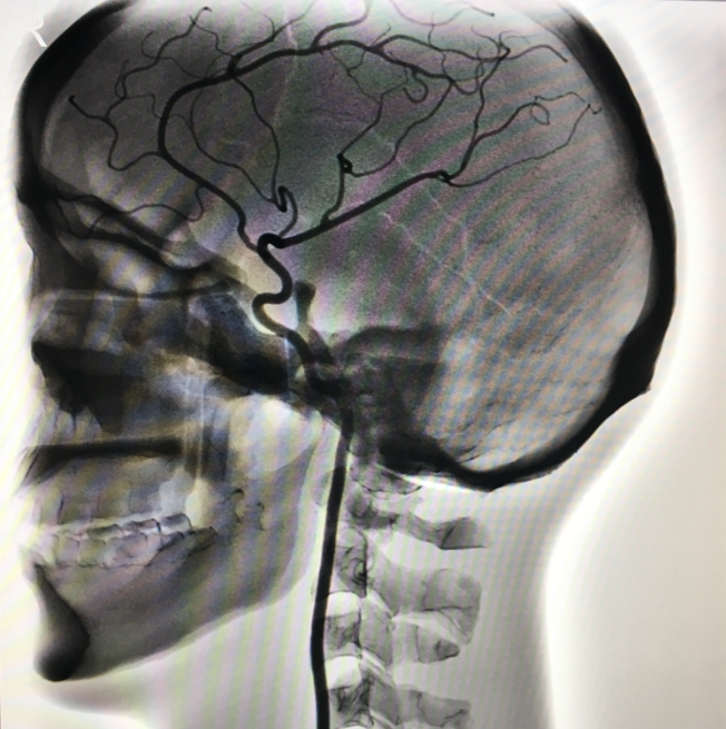 · 左半球腦動(dòng)脈中已注入有造影劑,可在血管機(jī)下顯示一側(cè)頭部血管圖像。
