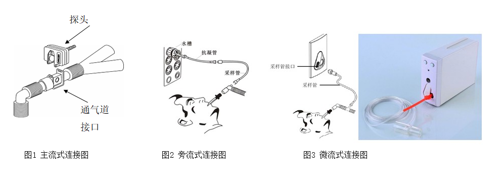 旁流,從主呼氣管道引一根小管,通過泵的作用抽氣,因為是采樣,所以精確度稍低,有一定延時,有耗材(脫水瓶)。