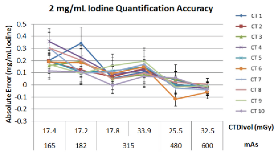 10臺(tái)多能CT掃描儀的碘化物棒定量精度為2 mg / mL,單位為mA。 準(zhǔn)確度平均為1年。