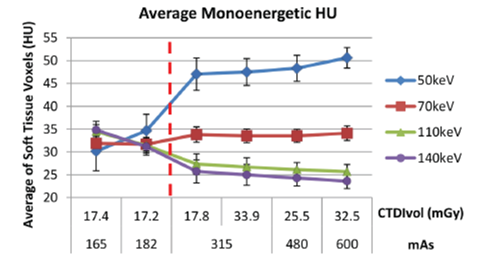 能量在50、70、110、140 keV之間,平均軟組織單能HU