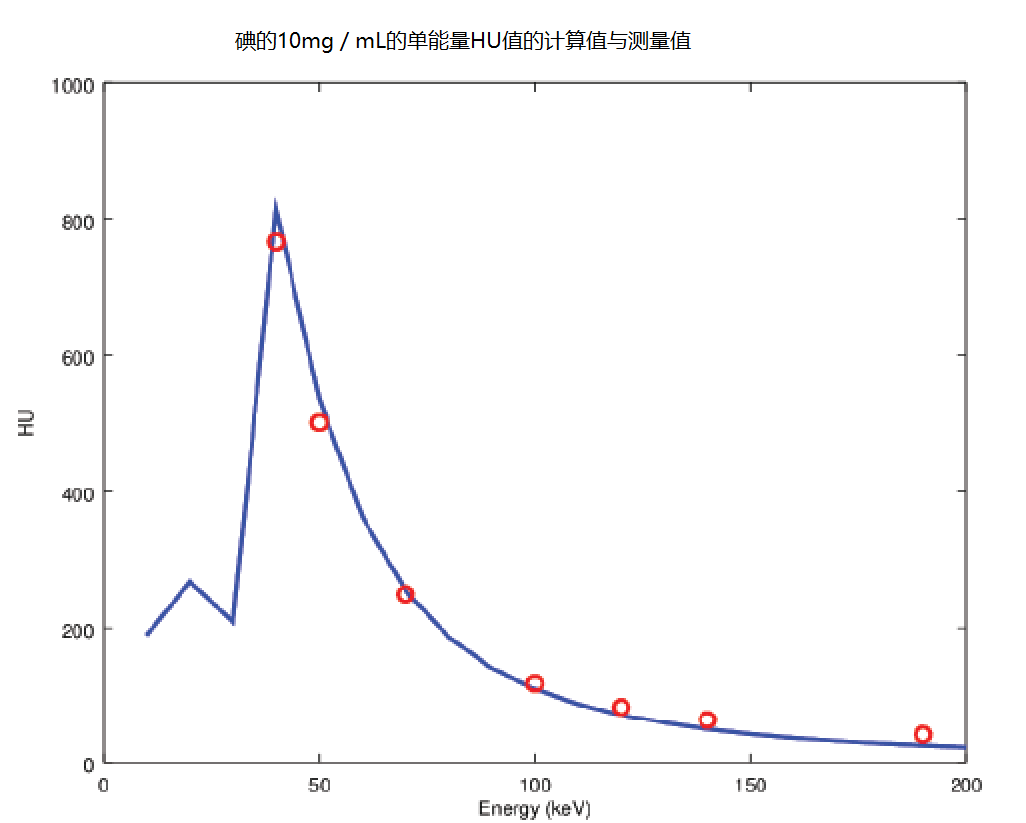 基于材料成分和NIST值(藍(lán)色曲線)與來(lái)自單能重建的HU值(紅色圓圈)的計(jì)算值。