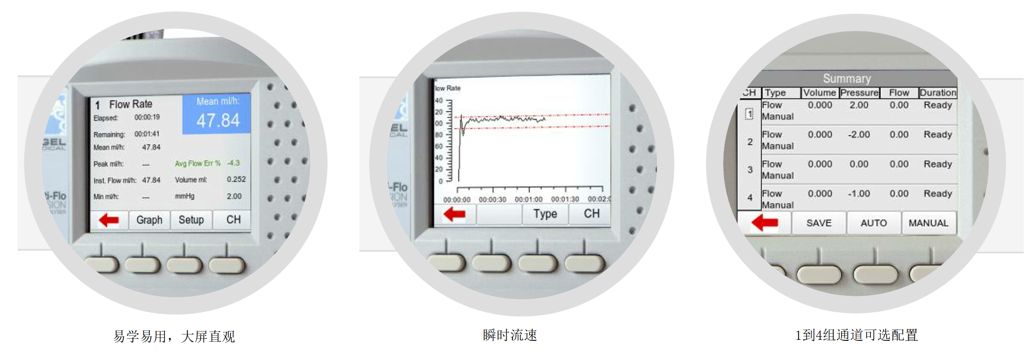 Multi-Flo輸液設(shè)備分析儀可以提供實時流量監(jiān)測(瞬時,平均流速,累計容積量等)、阻塞警報監(jiān)視、鎮(zhèn)痛泵藥量監(jiān)測、和人體背壓模擬功能。