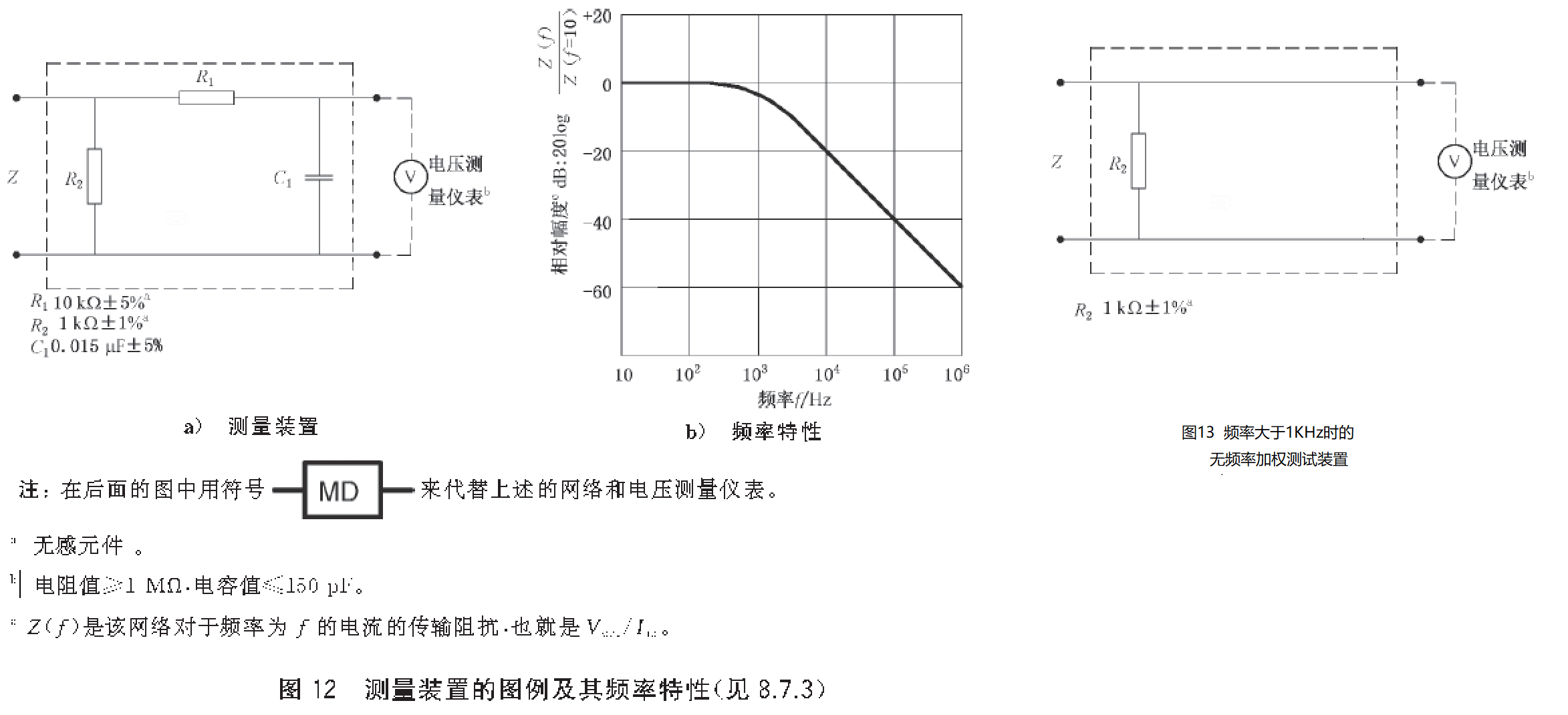 隨著頻率的升高,由MD測(cè)得的漏電流比實(shí)際值小得多,這正是和高頻時(shí),人體的感知/反應(yīng)閾值升高相一致的。所以可以得到對(duì)于電流或電流分量的評(píng)價(jià)。允許用單個(gè)儀器測(cè)量所有頻率的總效應(yīng)。當(dāng)出現(xiàn)頻率超過(guò)1KHz,數(shù)值超過(guò)10mA的電流和電流分量,就認(rèn)為超過(guò)了感知/反應(yīng)閾值,所以要用其他適當(dāng)?shù)氖侄蝸?lái)測(cè)量,見下面圖12b頻率特性頻率大于1KHz。此時(shí)的MD測(cè)量裝置需使用一個(gè)1kΩ 無(wú)感電阻和適合的測(cè)量?jī)x器來(lái)進(jìn)行。
