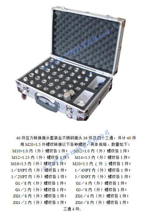 標準配置:壓力校驗臺1付,轉(zhuǎn)接頭組件(可選配),高精度壓力表(可選配),剛性容器組件(可選配)