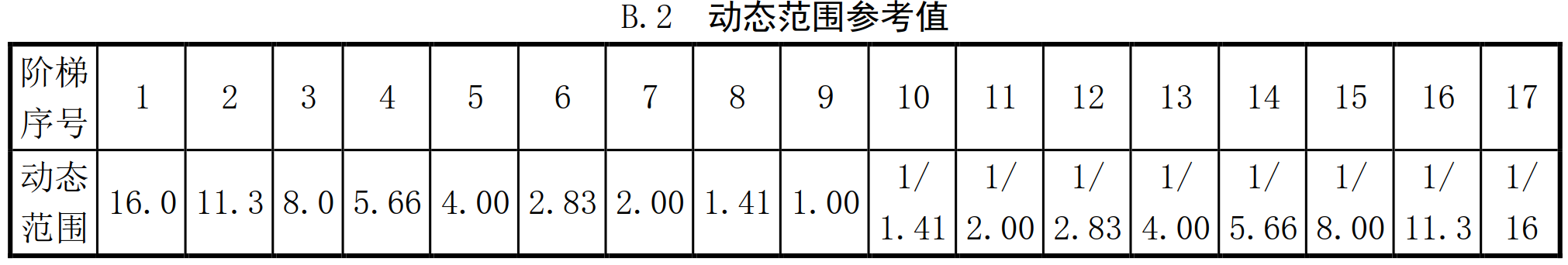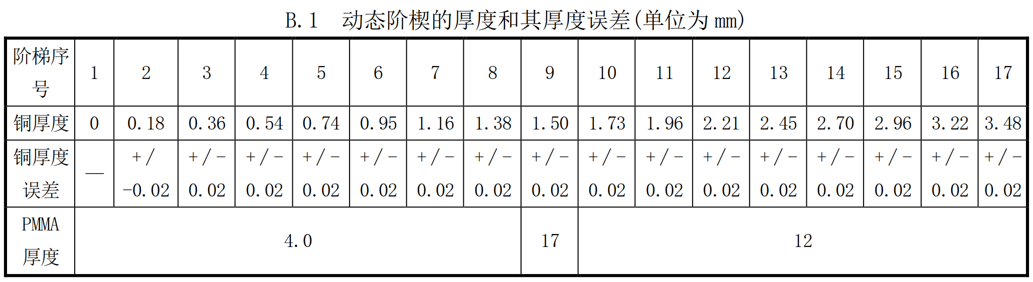 3.當(dāng) X射線管電壓設(shè)置在 75kV和使用 25mm Al 衰減體時(shí),則每一個(gè)銅階楔相對(duì)于第 9階梯的動(dòng)態(tài)范圍參考值見表 B.2。