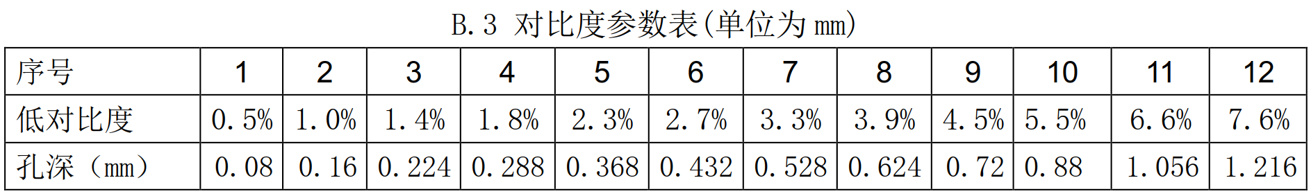 5.低對(duì)比度物體組件,其直徑為10mm 深度不同的孔(見圖B.1中 No.3) ,用于檢驗(yàn)低對(duì)比度分辨率,當(dāng)X射線管電壓為 75kV 和使用 25mm Al衰減體時(shí),孔的深度和對(duì)比度見表 B.3